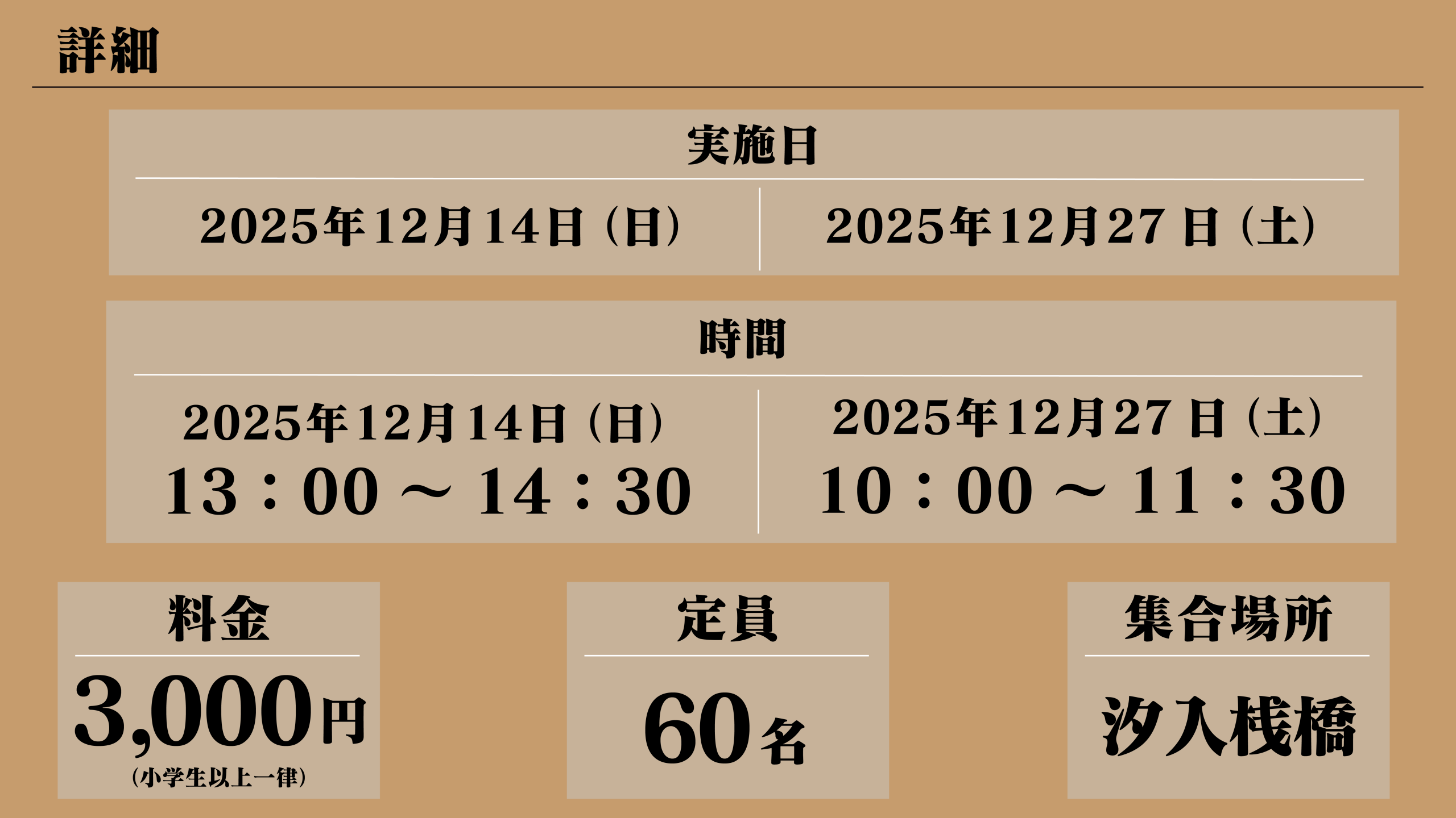 (3)集合場所(汐入桟橋)と解散場所(浦賀ドック)が異なるため、公共交通機関でお越しください。