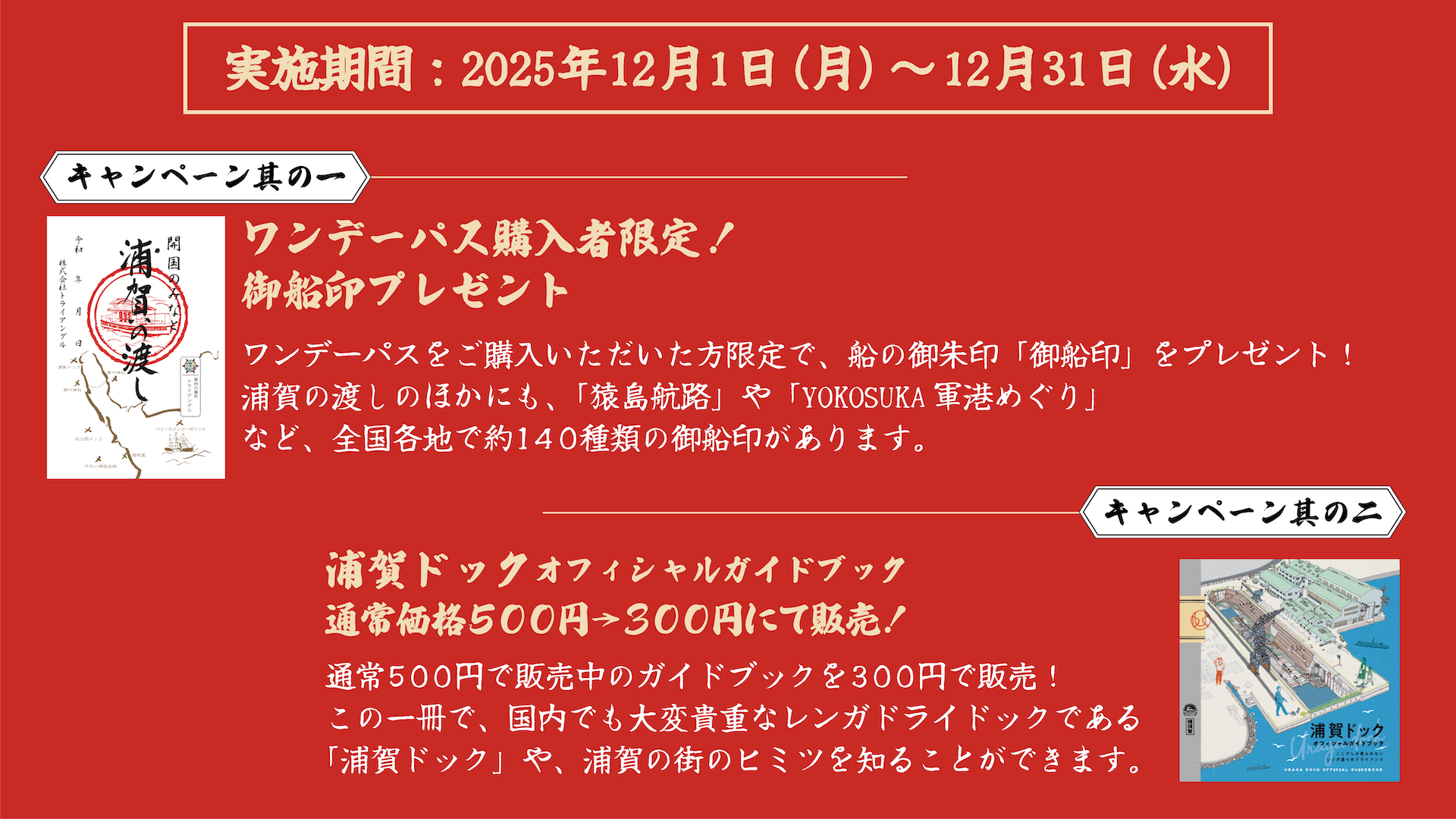 この節目を記念して、12月1日(月)〜31日(水)の期間、ワンデーパスを購入いただいた方には「御船印」をプレゼント。さらに船内で販売している浦賀のガイドブックは通常500円のところ300円で販売させていただきます。