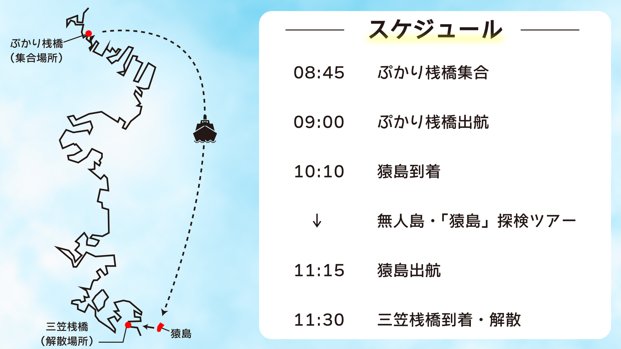 ※行程に含まれる無人島・猿島「探検」ツアーでは、急な坂や階段、ぬかるみ、足場の悪い箇所を歩く場合があるため、自力又は補助者が付いて安全に歩行が可能である方が参加対象です。